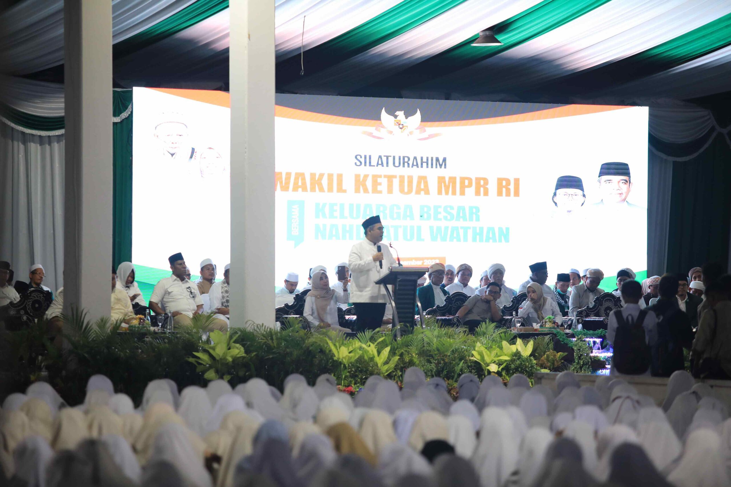 Sekjen Gerindra Ahmad Muzani bersilaturahmi ke pondok pesantren Nahdlatul Wathon, Lombok, Nusa Tenggara Barat, Jumat (1/12). Di hadapan ribuan santri, Muzani memaparkan apa yang menjadi program prioritas Prabowo-Gibran jika terpilih dalam Pilpres 2024 mendatang.