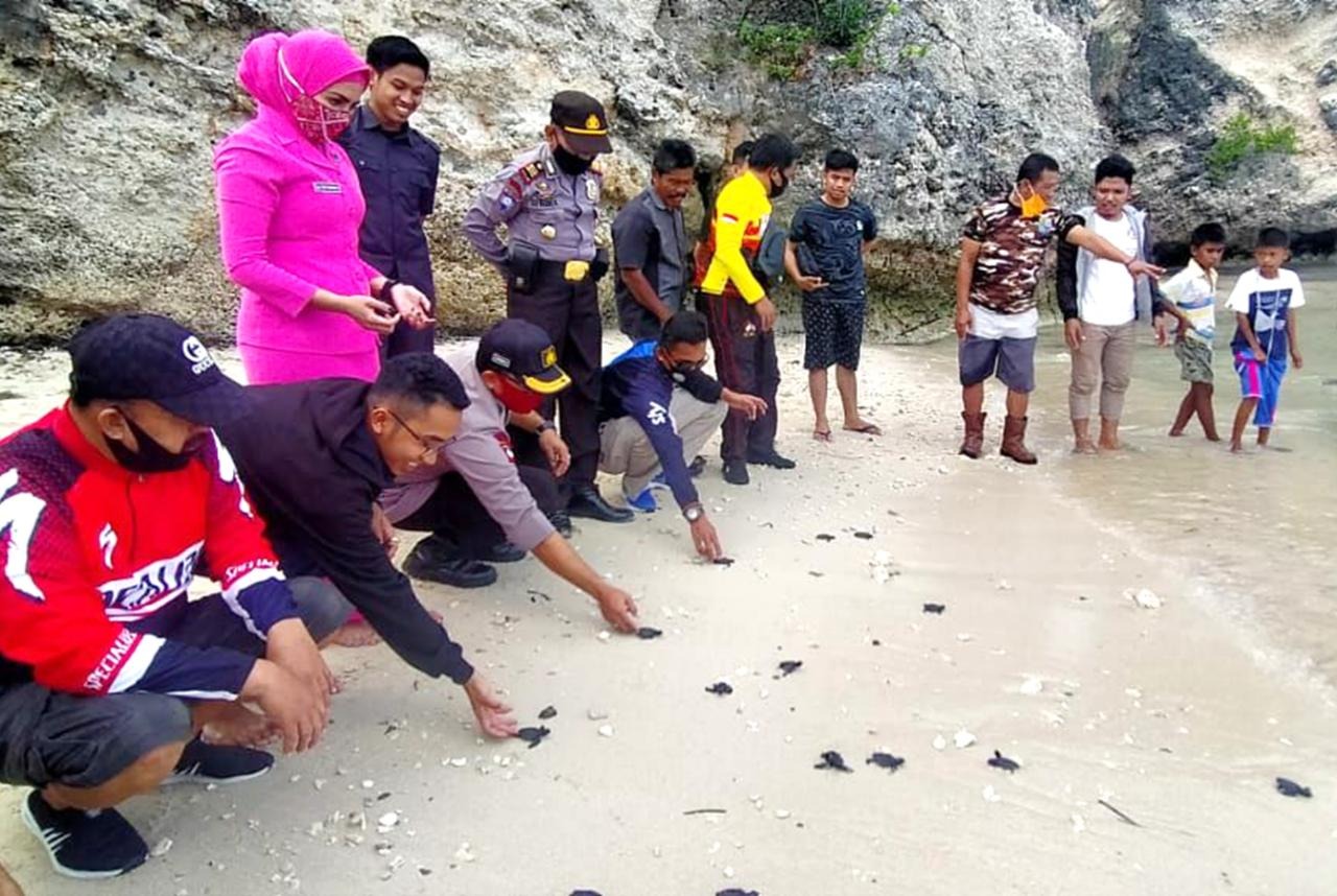 Seperti pelepasan 150 ekor anak penyu yang dilakukan Kapolres Majene AKBP Irawan Banuaji bersama Ketua Bhayanagkari Cabang Majene Ny Puty Banuaji, di Pesisir Pantai Desa Palipi Soreang Kecamatan Banggae, Sabtu (1/8/2020)