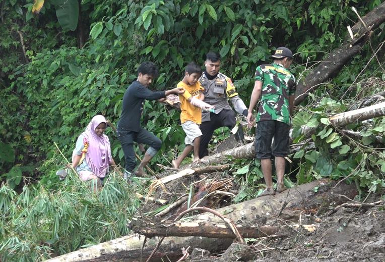 Dibantu personil polisi dari Polsek Tutar, warga yang ingin melanjutkan perjalanan, harus berjuang melewati material longsor yang terdiri dari tanah berlumpur bercampur batang kayu besar. (thaya/sur)