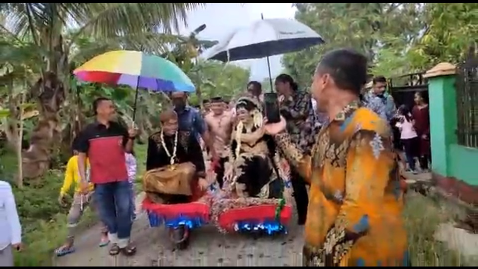 Dalam rekaman video pendek viral di media sosial, masing-masing pengantin yang tampak memakai pakaian khas suku Jawa, duduk di atas gerobak dorong yang telah dihias.