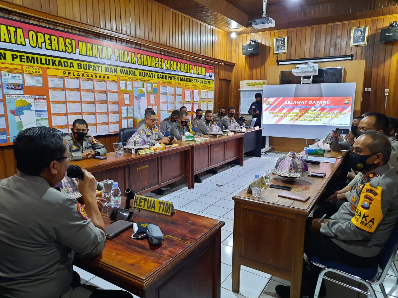 MAJENE – Tim Pengawasan Operasi (Wasops) Mantap Praja Itwasum Polri dipimpin Brigjen Pol Drs Suradiyana selaku Irwil Itwasum Mabes Polri melaksanakan kunjungan kerja ke Polres Majene di ruang Data Kapolres Majene, Kamis (3/11/2020).