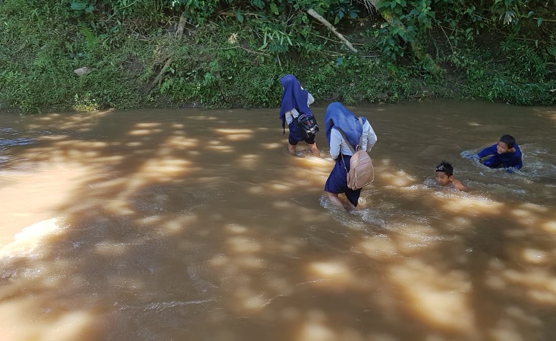 “Tiap hari mesti melewati sungai ini, tidak ada jalan lain, mesti melewati sungai,“ ujar salah satu anak, Mariana kepada wartawan, Selasa siang (07/09/2021).