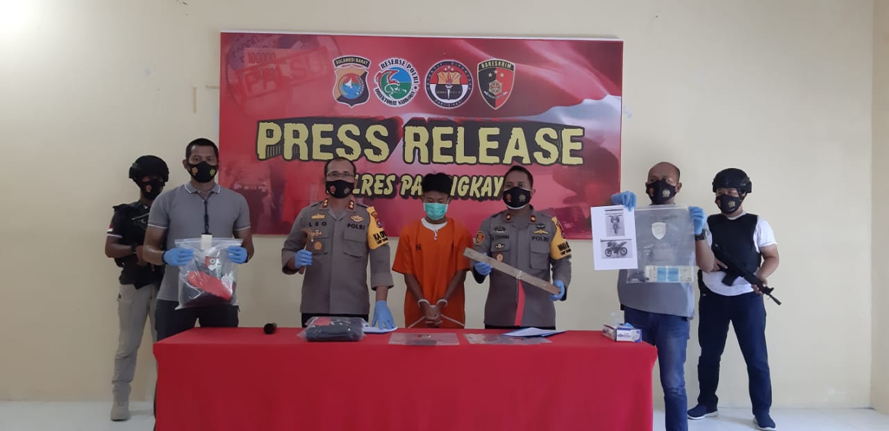 Release didepan perwakilan pers dengan menggunakan masker didampingi Waka Polres Kompol Ade Chandra C.Y, S.I.K, Kasat Reskrim AKP Pandu Arief Setiawan S.H, S.I.K, Ps.Kanit I Pidum Sat Reskrim Bripka Dominggus S.H dengan menghadirkan barang bukti dan tersangka MM (18) yang dikawal Sat Reksrim Polres Pasangkayu.