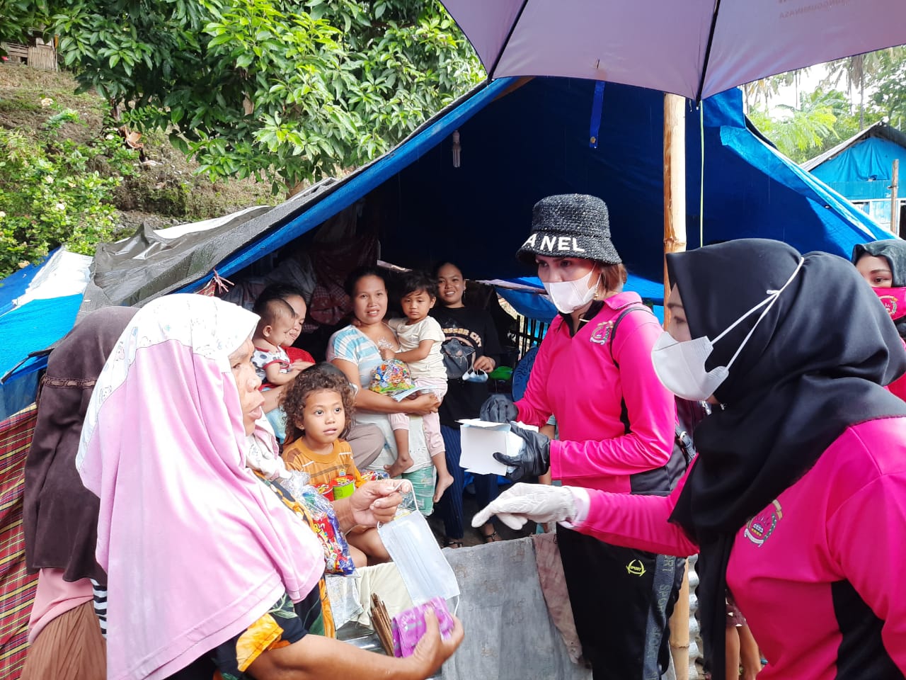 Kegiatan kemanusiaan dihiasi cuaca yang kurang mendukung, namun tidak menghalangi niat tulus para Bhayangkari untuk tetap menyalurkan bantuan, menghibur para pengungsi sekaligus membagikan masker agar protokol kesehatan tetap diperhatikan para pengungsi.