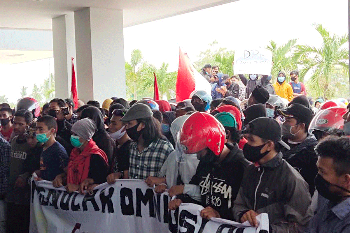 Di Sulbar, mahasiswa dan buruh bersatu menggelar aksi di sejumlah kabupaten. Mereka secara tegas menolak Undang-undang Omnibus Law.