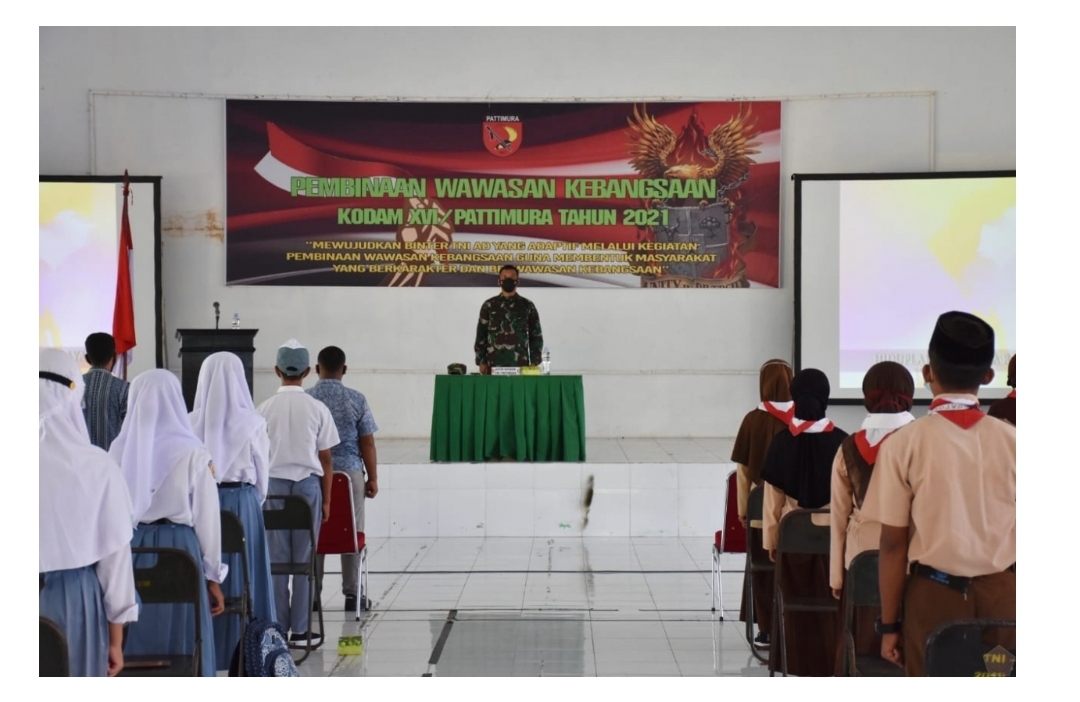 Dalam rangka membentuk dan menumbuhkan generasi masa depan penerus bangsa yang cinta tanah air, Kodam XVI/Pattimura melaksanakan Pembinaan Wawasan Kebangsaan TA 2021, bertempat di Aula Yonif R 733/Masariku, Kamis (08/04/2021), yang diikuti kurang lebih 60 orang peserta yang terdiri dari Tokoh Agama, Tokoh Pemuda, KBT dan perwakilan para siswa dan siswi dari SD, SMP dan SMU.