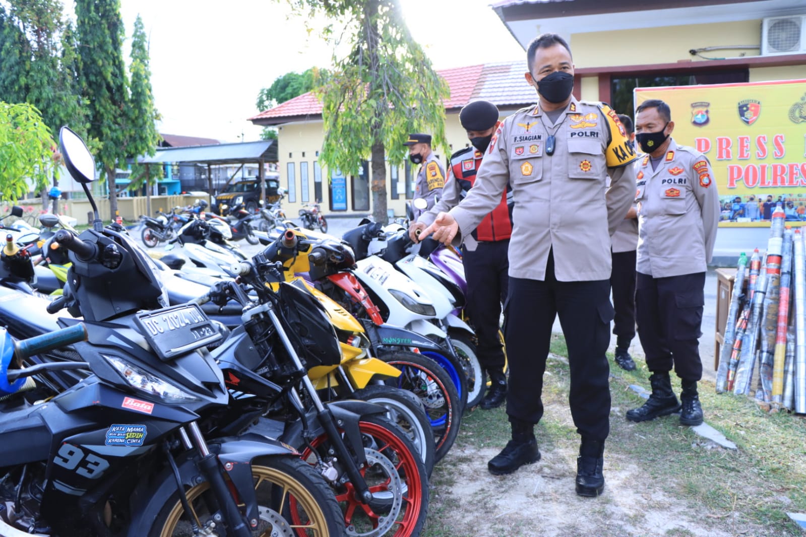 Barang bukti yang mengganggu Kamtibmas itu, berupa sepeda motor yang menggunakan knalpot bogar atau balapan liar sebanyak 39 unit dan sebanyak 38 buah meriam spiritus serta 3 jerigen miras jenis tuak.
