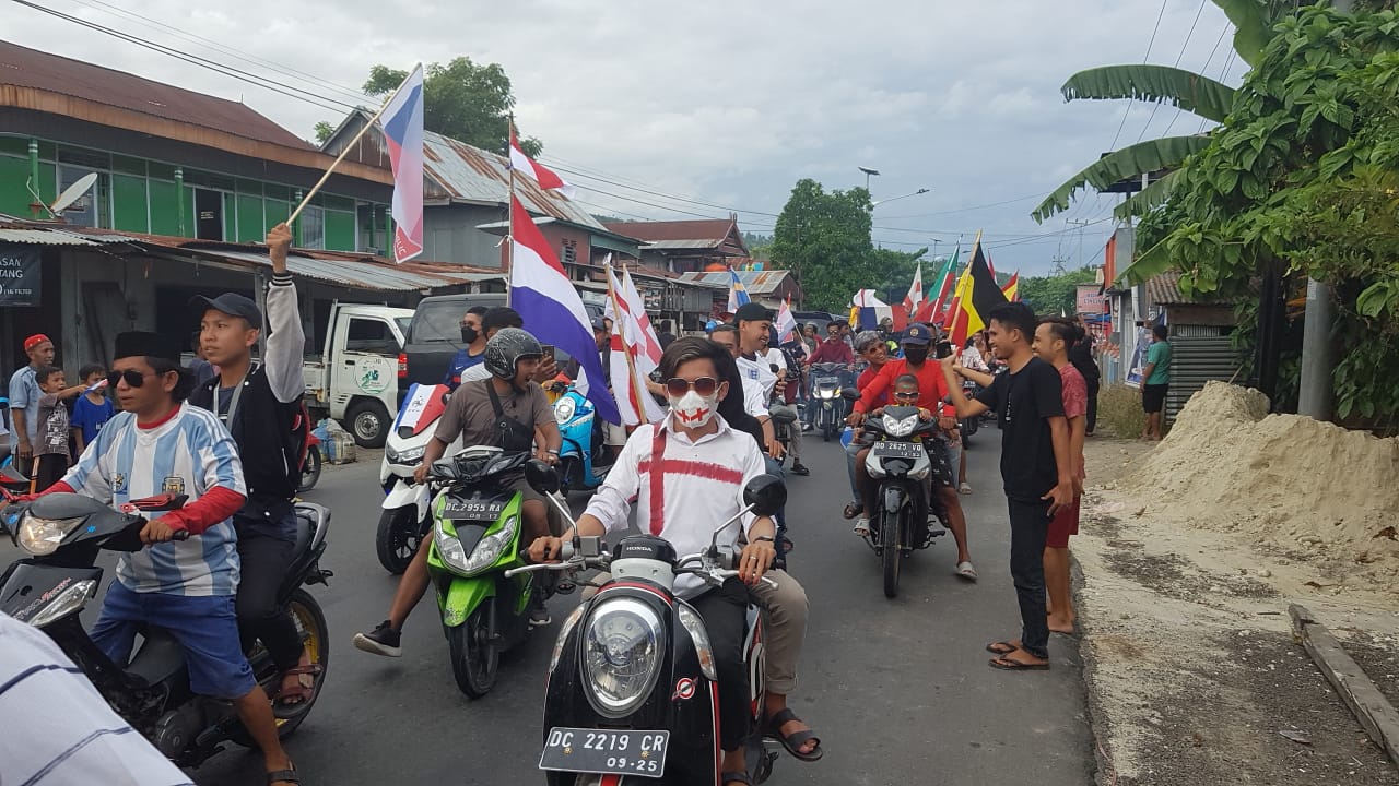 POLMAN– Ratusan warga di Kabupaten Polewali Mandar, Sulawesi Barat menggelar arak-arakan sambil membawa bendera Negara peserta Euro 2021.
