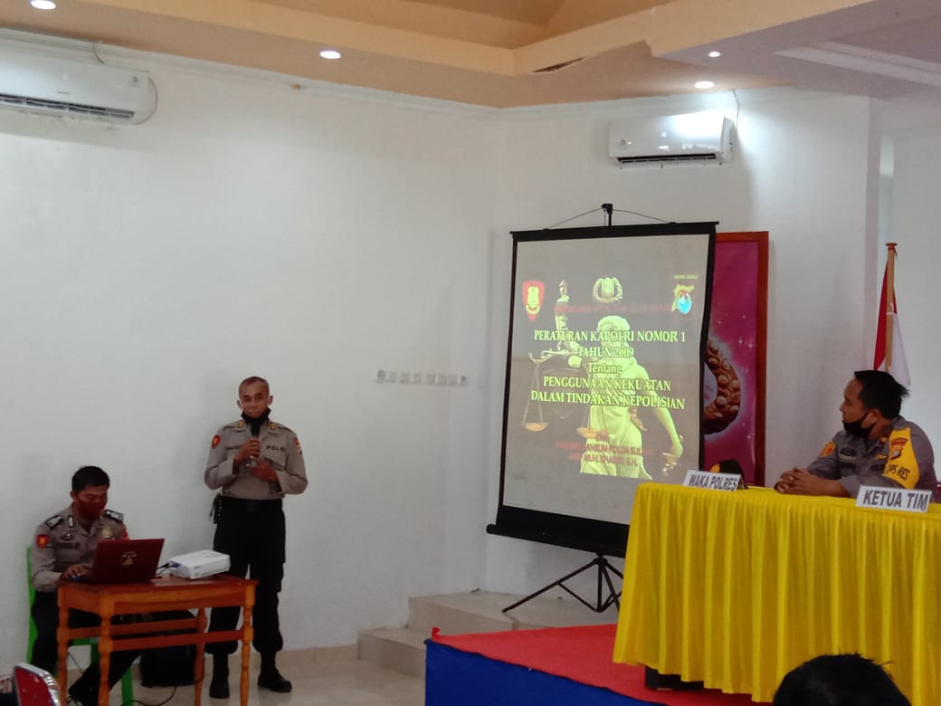 Siberindo, Pasangkayu – Guna meningkatkan pengetahuan personil Polri dalam melaksanakan tugas secara Professional, Modern dan Terpercaya, Team sosialisasi hukum Bidang Hukum (Bidkum) Polda Sulbar melaksanakan sosialisasi peraturan Kapolri nomor 14 Tahun 2011 tentang kode etik profesi Polri dan Perkap nomor 01 tahun 2009 tentang penggunaan kekuatan dalam tindakan kepolisian di Mapolres Pasangkayu pada hari Selasa (11/08/20).