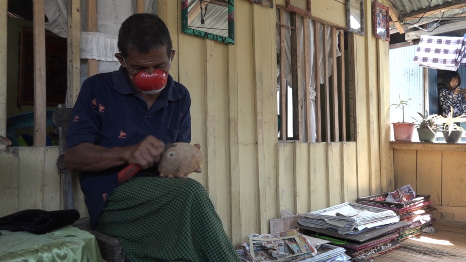 “Karena waktu itu susah mendapatkan masker, akhirnya saya berinisiatif untuk buat sendiri. Saca cari gergaji, cari tempurung (batok) kelapa, kemudian saya bentuk menyerupai masker,“ ujar Rahman, sembari mencontohkan cara membuat masker yang dipakainya.