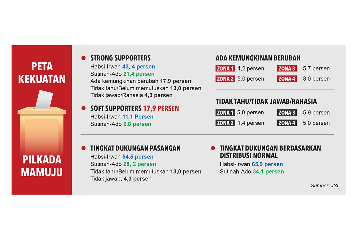 Hasil tersebut berdasarkan tingkat keterpilihan responden kepada Habsi-Irwan dan Sutinah Suhardi -Ado Mas’ud pada pilkada Mamuju nanti.