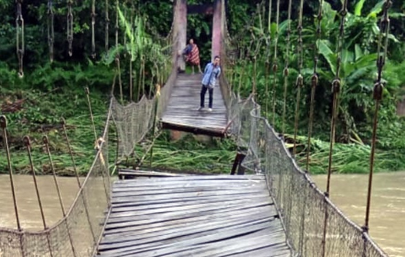 Peristiwa rusaknya jembatan gantung menuju Desa Lenggo hingga tidak dapat dilalui warga, terjadi Jumat malam (12/11). Sebahagian lantai jembatan terlepas hingga hanyut terbawa Banjir luapan sungai.