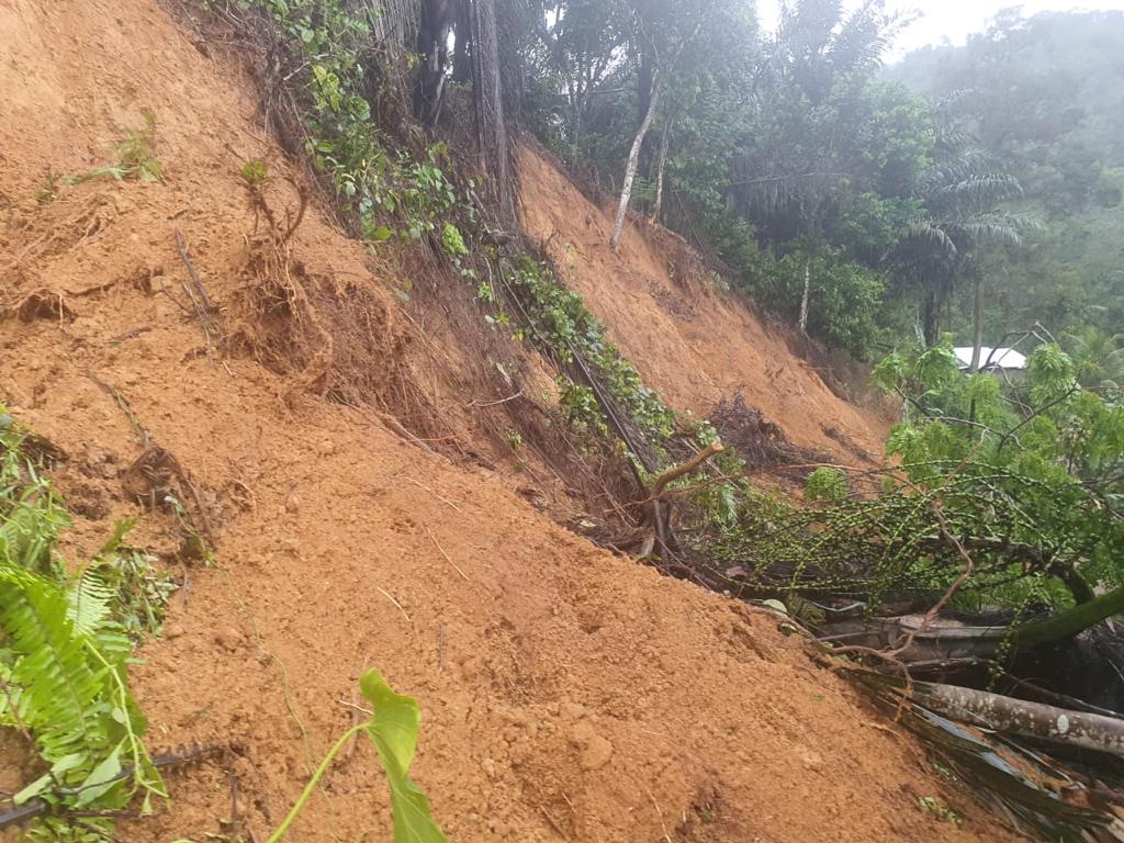 Material longsor terdiri dari tanah berlumpur, bercampur bebatuan dan batang pohon, membuat dua rumah diantaranya rata dengan tanah. Selain itu, sebuah jembatan gantung juga ambruk akibat diterjang luapan sungai, yang turut menggenangi ratusan rumah warga.