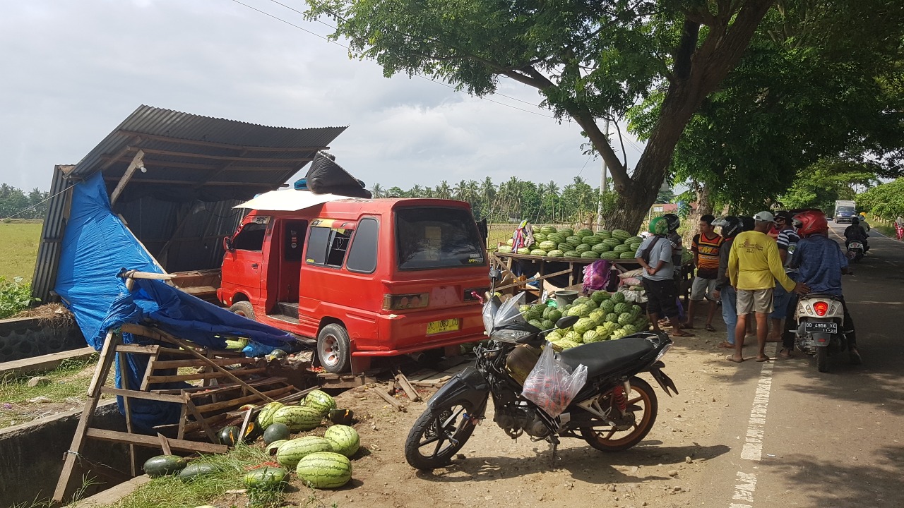 POLMAN- Kecelakaan tunggal kembali terjadi di Kabupaten Polewali Mandar. Sebuah kios dan lapak ratusan buah buah semangka yang berada di sisi jalan Trans Sulawesi, hancur diseruduk mikrolet yang hilang kendali.
