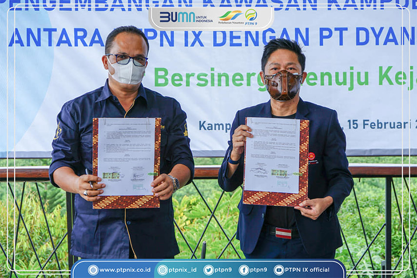 Bawen – Sebagai indak lanjut penandatanganan Nota Kesepahaman antara PT Perkebunan Nusantara IX dan PT Dyandra promosindo bulan Oktober tahun 2020, kedua perusahaan sepakat menandatangani Surat Perjanjian Kerjasama pengelolaan Agrowisata Kampoeng Kopi Banaran pada hari Senin, 15 Februari 2021. Penandatanganan dilakukan oleh SEVP Business Support PTPN IX – Wispramono Budiman dan Direktur PT Dyandra Promosindo – Hendra Noor Saleh di Banaran Skyview.