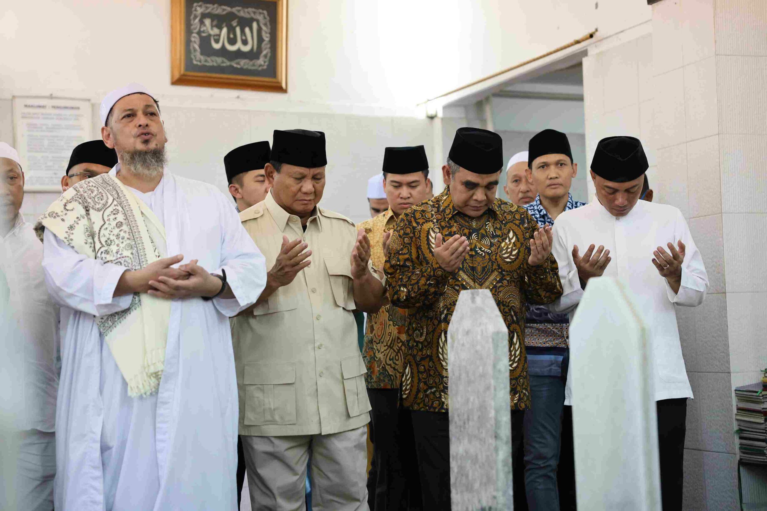 Calon presiden Prabowo Subianto ziarah ke makam Habib Ali bin Abdurrahman Al-Habsyi di Masjid Al Riyadh di Jalan Kembang VI, Kwitang, Jakarta Pusat, Jumat (16/2/2024). Saat tiba, Prabowo disambut langsung oleh Habib Ali Kwitang, Sekjen DPP Gerindra Ahmad Muzani beserta jajaran DPP Gerindra , Endipat Wijaya, dan Adnan Taufik.