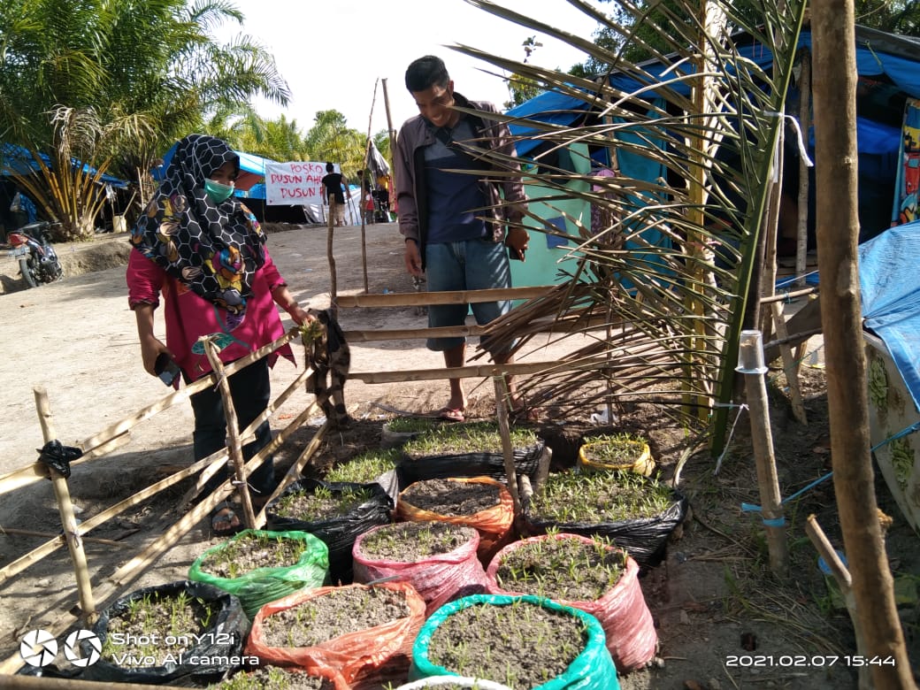 Seperti yang terlihat pada salah satu pengungsian di Desa Mekatta, Kecamatan Malunda. Kegiatan bercocok tanam dilakukan para relawan dan warga korban gempa dengan membuat petak-petak kecil di depan tenda pengungsian masing-masing. Tanaman yang dibudidayakan, berupa sayuran seperti bayam, kangkung dan lainnya.