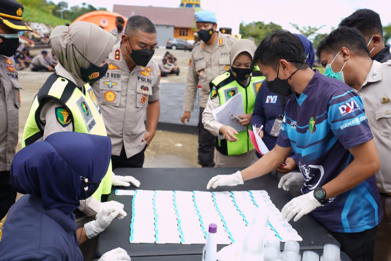 Nampak dalam kegiatan tersebut, seluruh personil secara bergantian memasuki toilet dengan pengawasan ketat anggota Propam untuk mengambil air seninya menggunakan tempat yang telah disiapkan dan diserahkan kepada petugas kesehatan.
