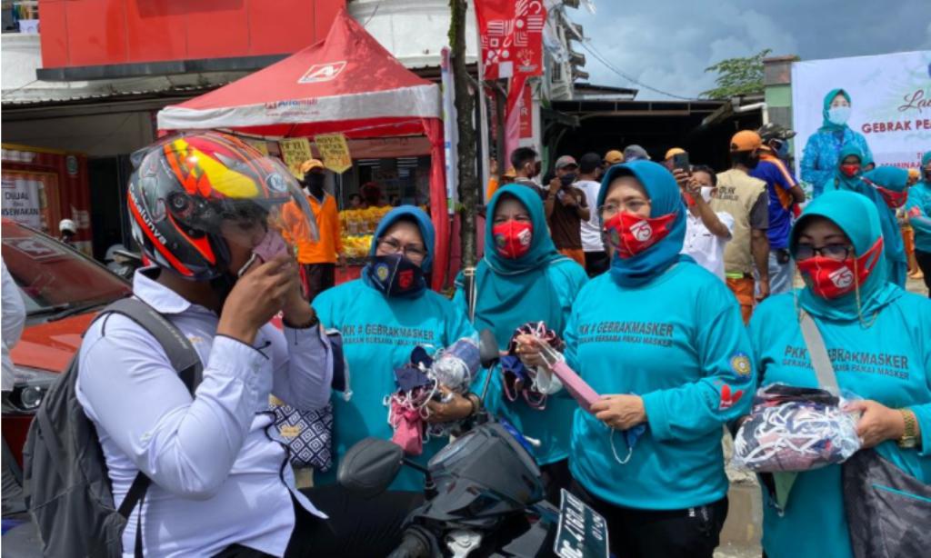 Mamuju – Ketua Tim Penggerak PKK Sulawesi Barat, Andi Ruskati Ali Baal, memimpin pembagian 5000 masker secara gratis ke masyarakat dalam kegiatan Gebrak Masker, Senin (17/8).