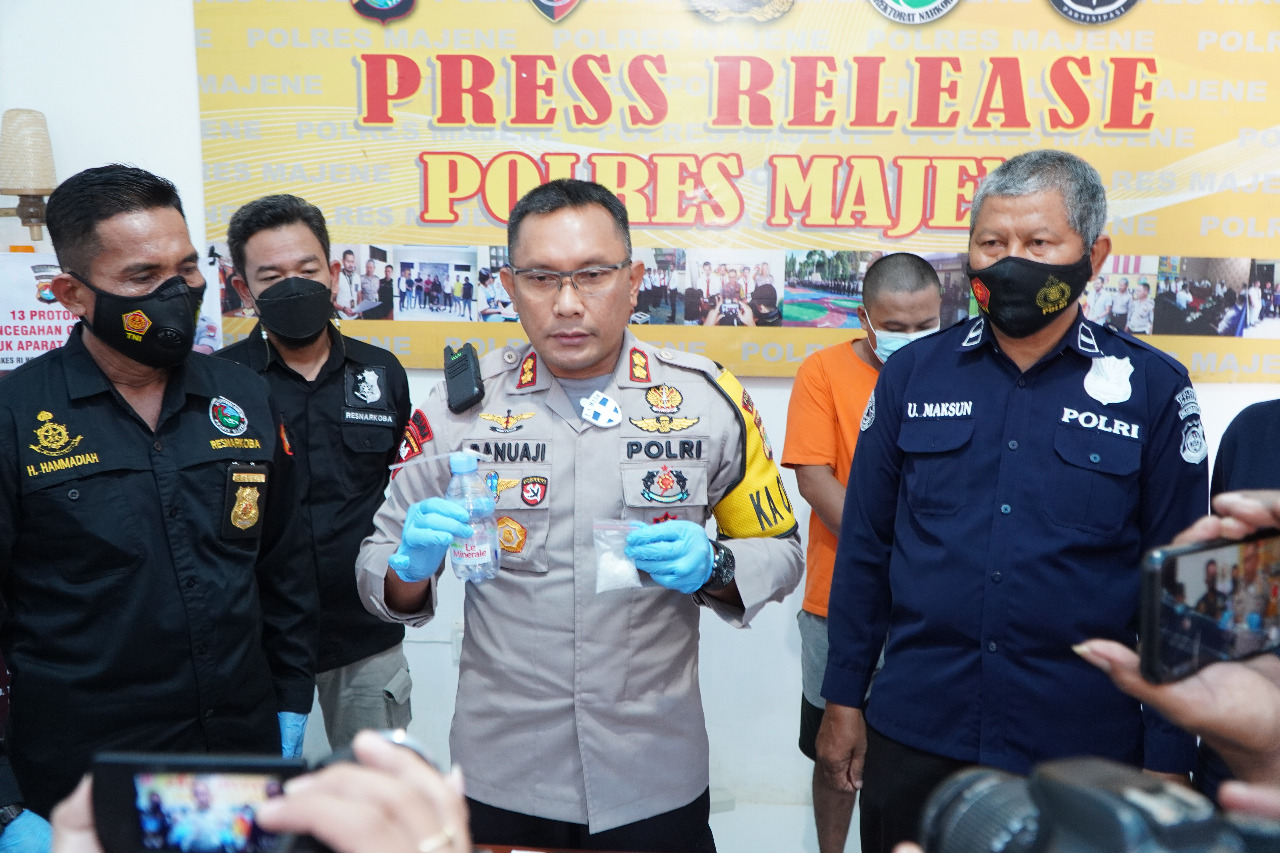 Kapolres Majene AKBP Irawan Banuaji menyebut, dari tangan SK ditemukan barang bukti barupa dua sacet plastik yang berisi kristal bening yang diduga kuat sabu dengan berat masing-masing 9,7638 dan 0,0850 gram.