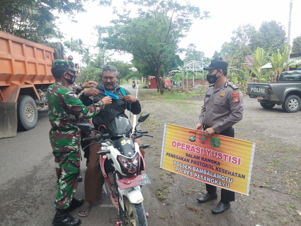 Operasi Yustisi dipimpin Danramil 1427-02 Rondomayang Kapten Inf Ismail bersama Kapolsek Bambalamotu Iptu Muhammad Nur di Kasuloang, Kecamatan Bambaira, Pasangkayu, Rabu (18/11/2020).