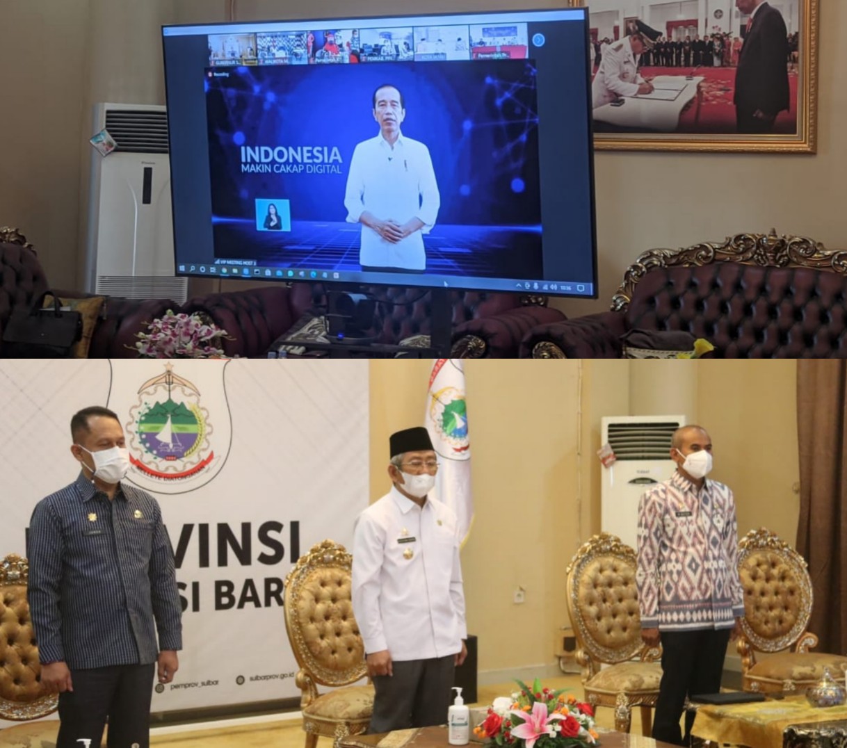 MAMUJU-  Gubernur Sulawesi Barat, HM Ali Baal Masdar, mengikuti peluncuran Literasi Digital Nasional secara virtual bertema “Indonesia Makin Cakap Digital”. Gubernur Didampingi Asisten Bidang Pemerintahan dan Kesra, Muh Nasir, dan Asisten Bidang Perekonomian dan Pembangunan, Junda Maulana, di rumah jabatan Gubernur, Kamis (20/05/2021).