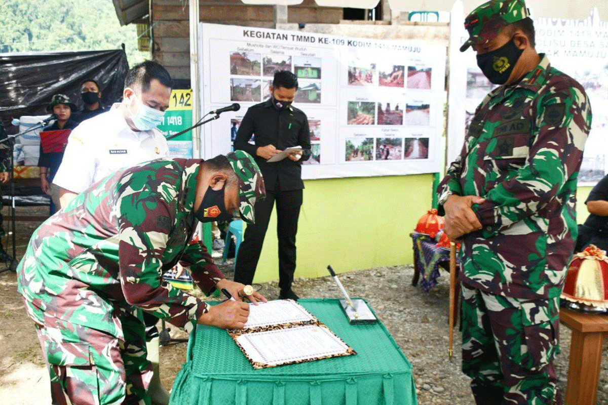 Acara penandatanganan oleh kedua belah pihak Dandim 1418 Mamuju Kolonel Inf. Tri Aji Sartono selaku Dansatgas TMMD 109 dan Pjs. Bupati Mamuju Tengah Bau Akram Da’i. Disaksikan langsung Danrem 142 Tatag Brigjen TNI Firman Dahlan.
