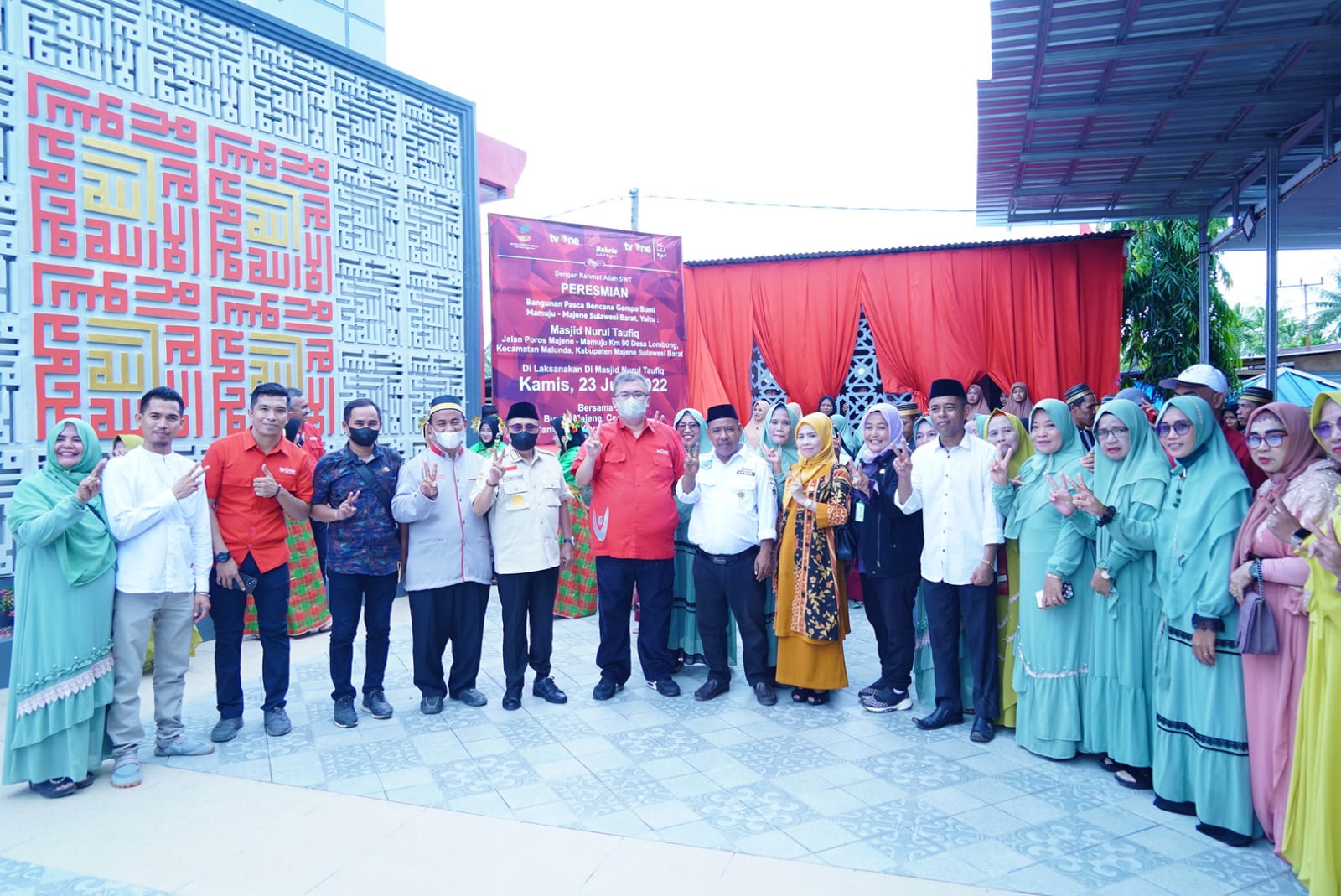 Bupati Majene Andi Achmad Syukri foto bersama setelah meresmikan Masjid Nurul Taufik dari Yayasan SUN TvOne di Jalan Poros Majene-Mamuju Desa Lombong Kecamatan Malunda, Kamis (23/06/2022)MAJENE – Salah satu bentuk sedekah jariyah yang bisa dilakukan umat Muslim adalah membangun Masjid yang mengandung keutamaan besar bagi yang mampu mengamalkannya.