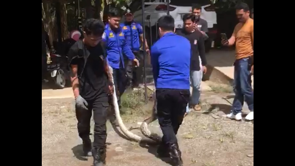 Dalam rekaman video pendek yang beredar luas, terlihat sejumlah petugas damkar, berupaya menarik ular yang bersembunyi di bawah mobil berwarna hitam.