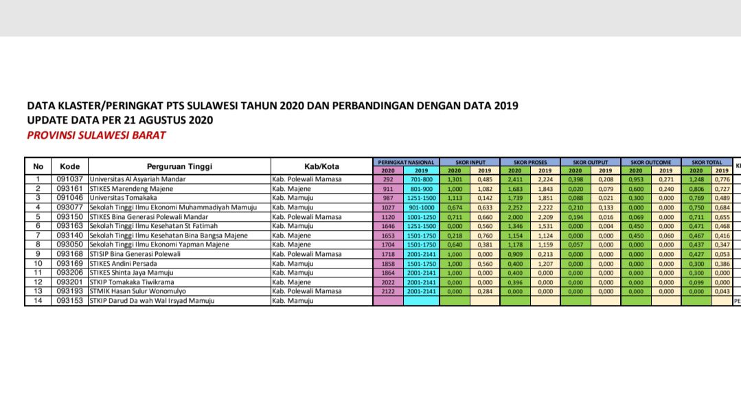 Rilis peringkat Perguruan Tinggi (PT ) tersebut sebagaimana diberitakan oleh salah satu media Daring menyebutkan Universitas Al Asyariah Mandar (Unasman) menjadi satu-satunya Kampus yang berhasil masuk dalam Klaster IV (Empat) Perguruan Tinggi dengan posisi peringkat pertama di Sulawesi Barat, Menyusul kemudian kampus lainnya di Klaster 5, diantaranya Stikes Marendeng Majene di Peringkat kedua dan Universitas Tomakaka Mamuju di Peringkat ketiga, disusul secara berurut STIE Muhammadiyah Mamuju, STIKES Biges Polman, Universitas Sulawesi Barat, STIKES Bina Bangsa Majene, STIE Yapman Majene, STISIP Biges Polman, STIKES Andini Persada Mamuju, STIMIK Hasan Sulur Polman dan Institut Kesehatan dan Bisnis St. Fatimah Mamuju.