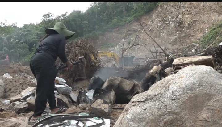 Setelah selesai mengumpulkan batu pecah, Lena kembali memeriksa batu yang telah dibakar. Seluruh permukaan batu sudah tampak menghitam akibat proses pembakaran. Itu pertanda batu siap dipukul dengan hantaman palu untuk memecahkannya menjadi bongkahan.