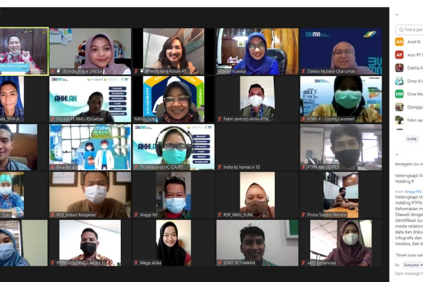 ” FGD ini kami gelar awalnya untuk membekali pemahaman dan kompetensi personil humas tiga PTPN di Jawa Timur, kemudian kami coba kembangkan untuk peserta umum. Kali ini sebagai narasumber praktisi humas perempuan, dengan latar belakang praktisi dan akademisi melengkapi khasanah kehumasan peserta. Sebelumnya kami juga menghadirkan rekan jurnalis, staf dinas komunikasi dan informatika hingga akademisi. Ini kali kelima FGD diselenggarakan secara virtual, mengingat kondisi pandemi covid19 “, ungkap Brilliant Johan Anugrah Humas PTPN XI selaku person in charge kegiatan tersebut. (*/cr6/