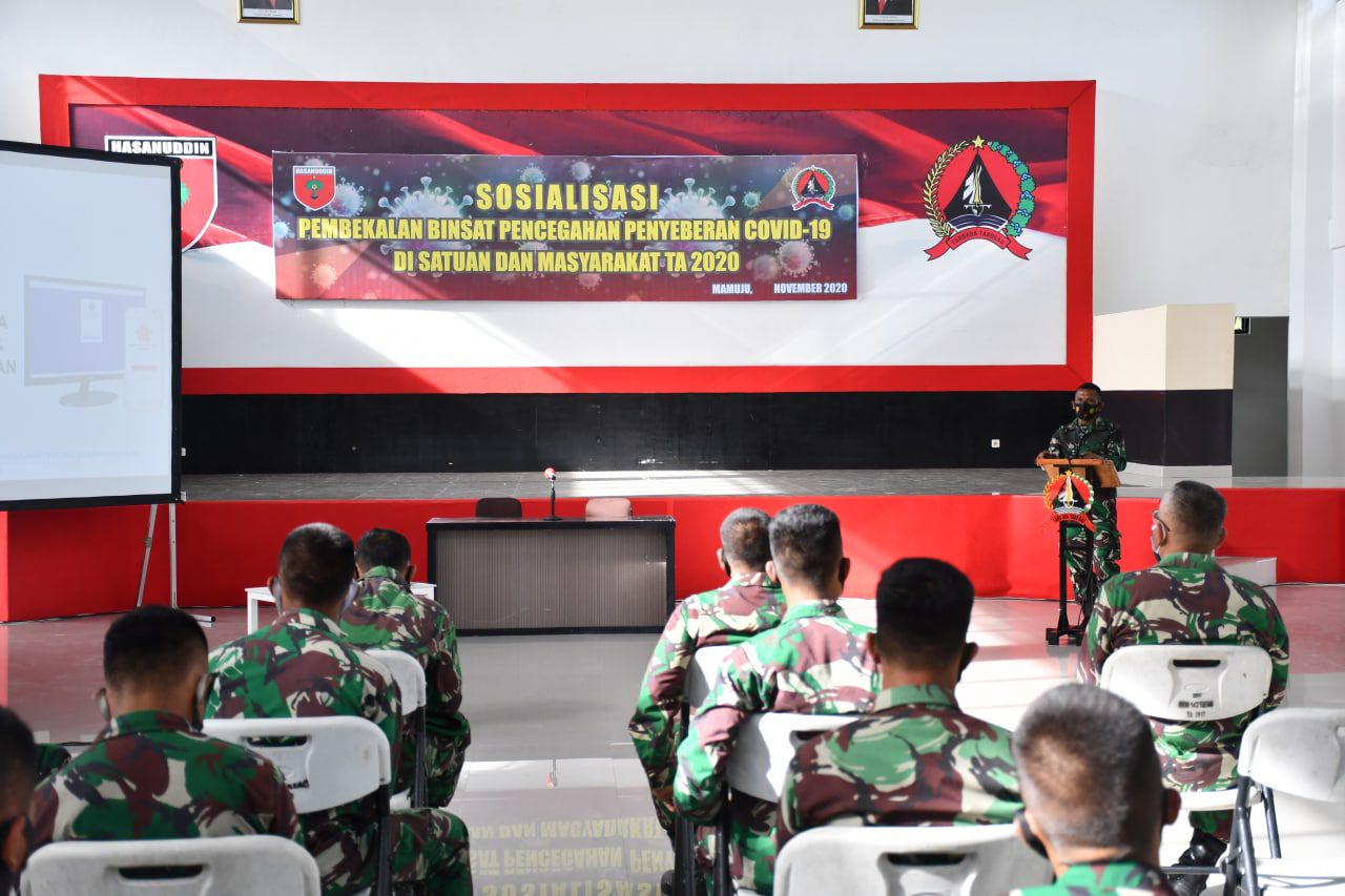 MAMUJU- Bertempat di Aula Andi Depu Korem 142/Tatag Jalan Abd Malik Pattana Endeng, Mamuju, Sulawesi Barat, berlangsung Sosialisasi pembekalan Binsat dan pencegahan penyebaran Covid 19 di Satuan dan Masyarakat.