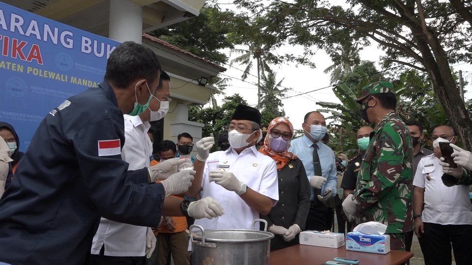 Pemusnahan yang dihadiri Gubernur Sulawesi Barat, Ali Baal Masdar, bersama unsur Forkopimda lainnya, berlangsung di depan Kantor Badan Narkotika Nasional Kabupaten (BNNK) Polewali Mandar, Rabu pagi (28/04/2021).
