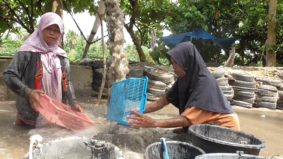 Tangan Sawiah tampak lincah, memanfaatkan ayakan plastik sebagai alat penyaring untuk memisahkan pasir dan kerikil sungai yang mengalir melalui pipa seukuran paha orang dewasa.