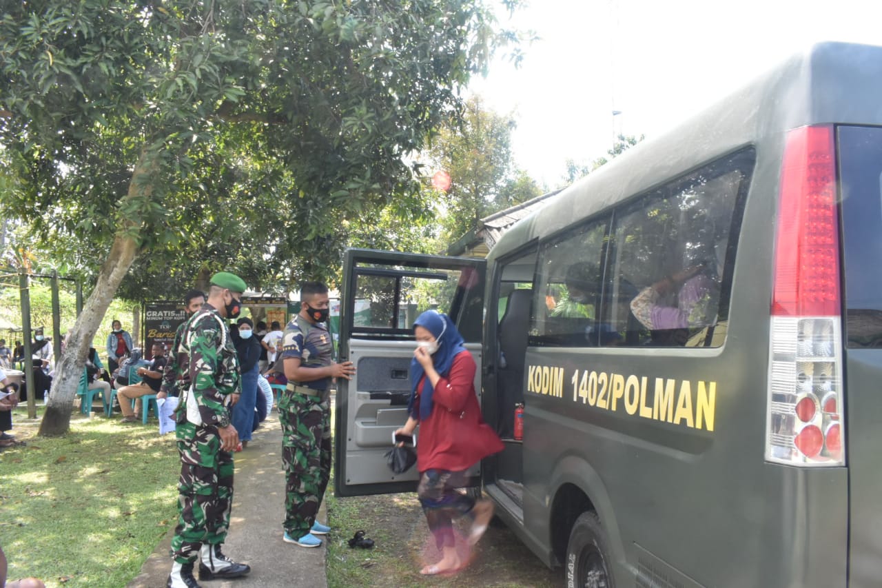 POLMAN– Personil TNI dari Kodim 1402 Polman dikerahkan menjemput warga di Kabupaten Polewali Mandar, Sulawesi Barat, untuk mendapatkan vaksin. Menggunakan kendaraan dinas baik roda dua maupun empat, secara door to door, mereka mendatangi warga kemudian diantar menuju lokasi pelaksanaan vaksinasi Covid-19.