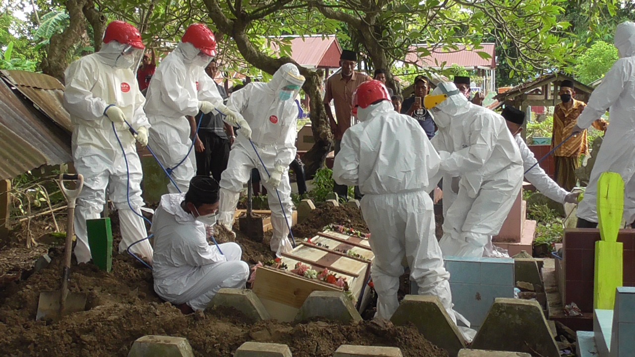 Kendati proses pemakaman almarhum yang diketahui berinisial SU (53) menerapkan protokol Covid-19, namun sayang banyak pelayat yang hadir mengabaikan protokol kesehatan (prokes). Salah satunya tidak memakai masker.