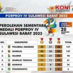 MAMUJU – Perolehan medali sementara Pekan Olahraga ( Porprov ) Sulbar ke 4 tahun 2022, bersaing ketat antara tuan rumah Mamuju dan