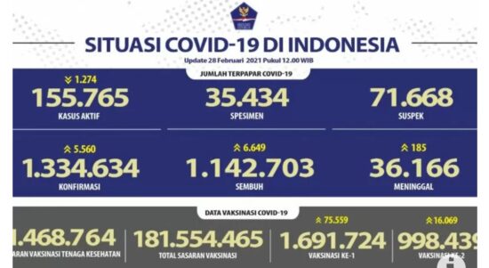 Jakarta – Satgas Penanganan Covid-19 mengumukakan jumlah pasien yang sembuh dari Covid-19 di Indonesia pada Minggu, 28 Februari 2021, bertambah 6.649 sehingga
