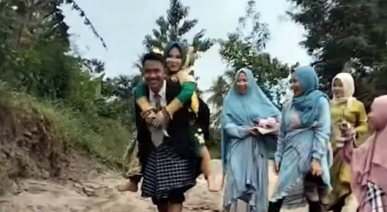 Viral! Mempelai Pria Gendong Istri Seberangi Sungai di Polman
