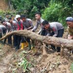 POLMAN– Puluhan Personil kepoolisian dari Polres Polewali Mandar, Sulawesi Barat dikerahkan untuk membersihkan sejumlah titik longsor yang menutup akses jalan di Desa